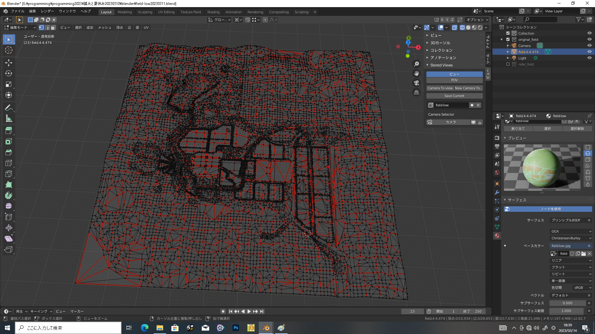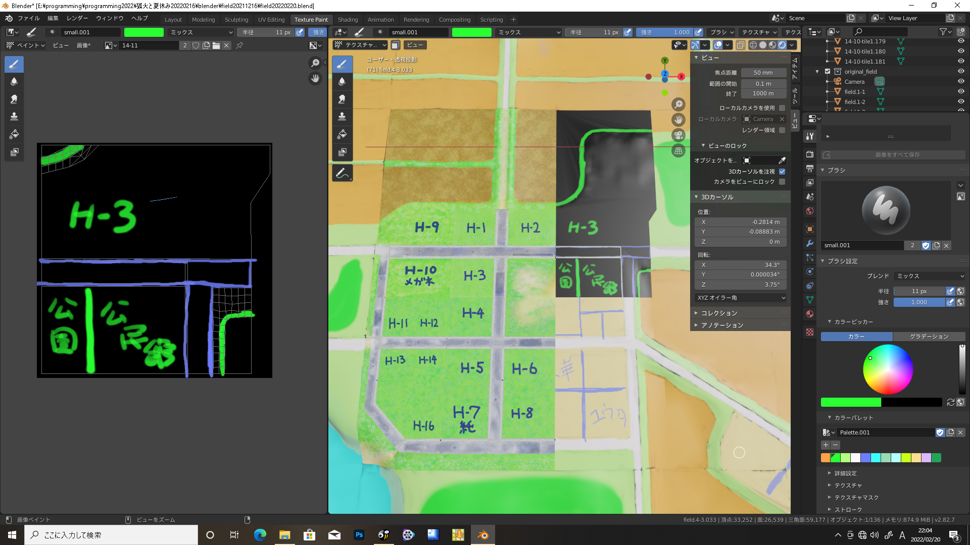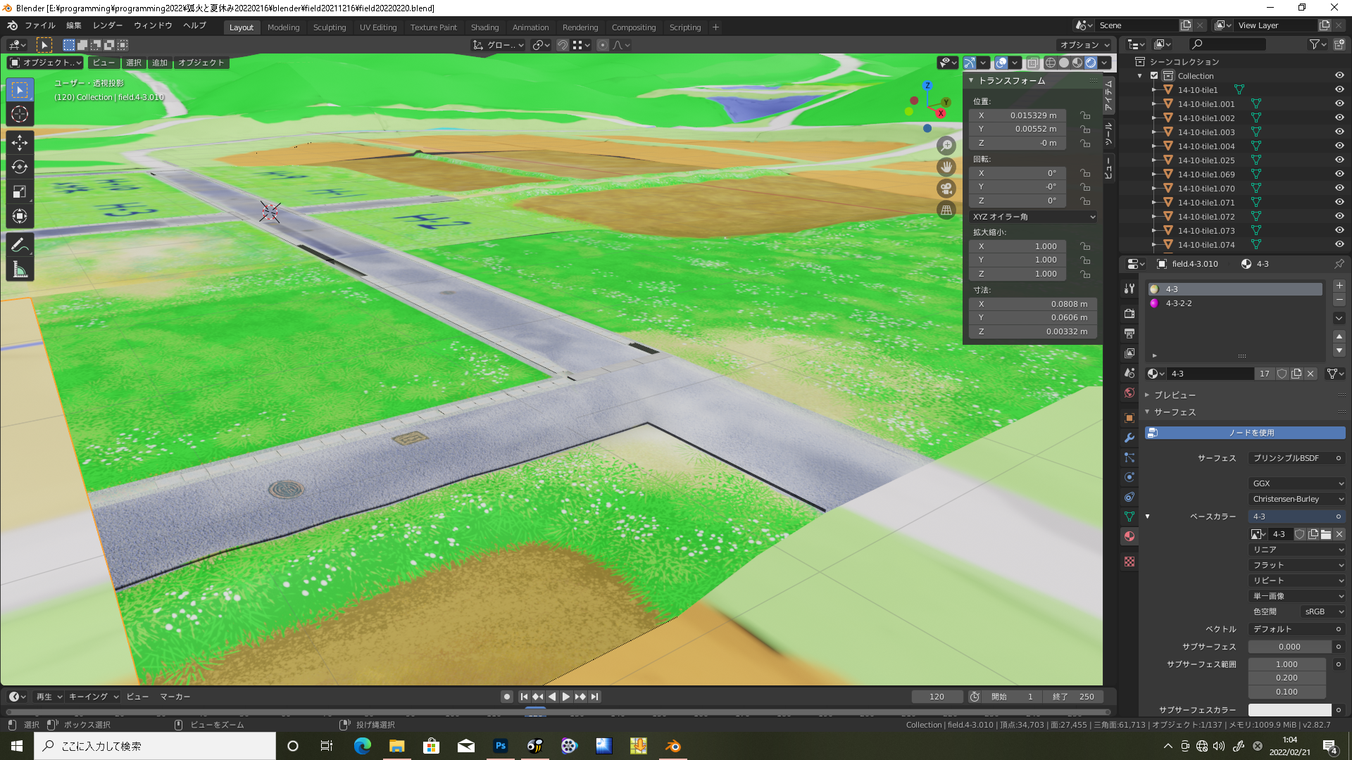 前回のテストフィールドではフィールドを7×7のブロックに分割していましたがモデルの解像度が低かったので今回1ブロックを更に4×4のブロックに分割しました。フィールド全体では26×26=676のブロックがあります。このブロック一つ一つをUV展開してPhotoshopでテクスチャを作る訳です。ここにスマートな解決方法などありません。力技で676ブロック作るのです!