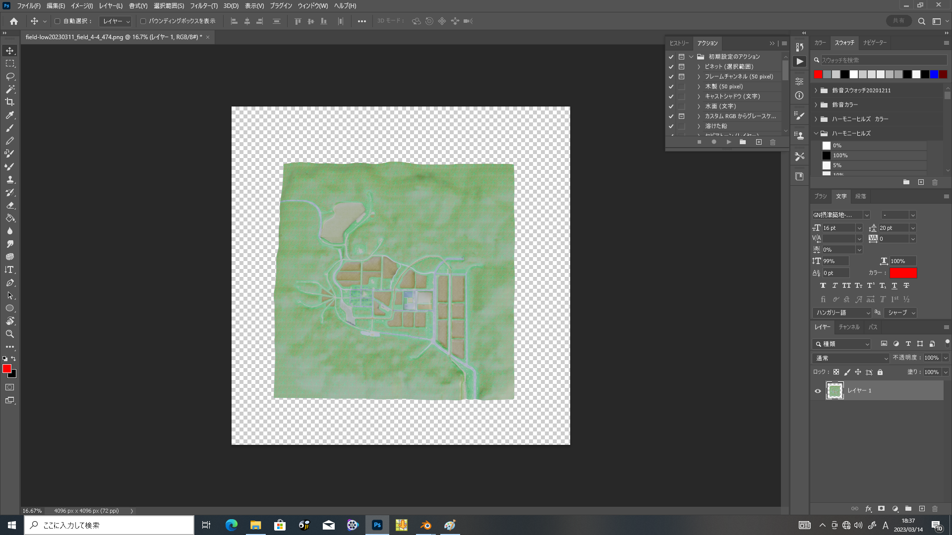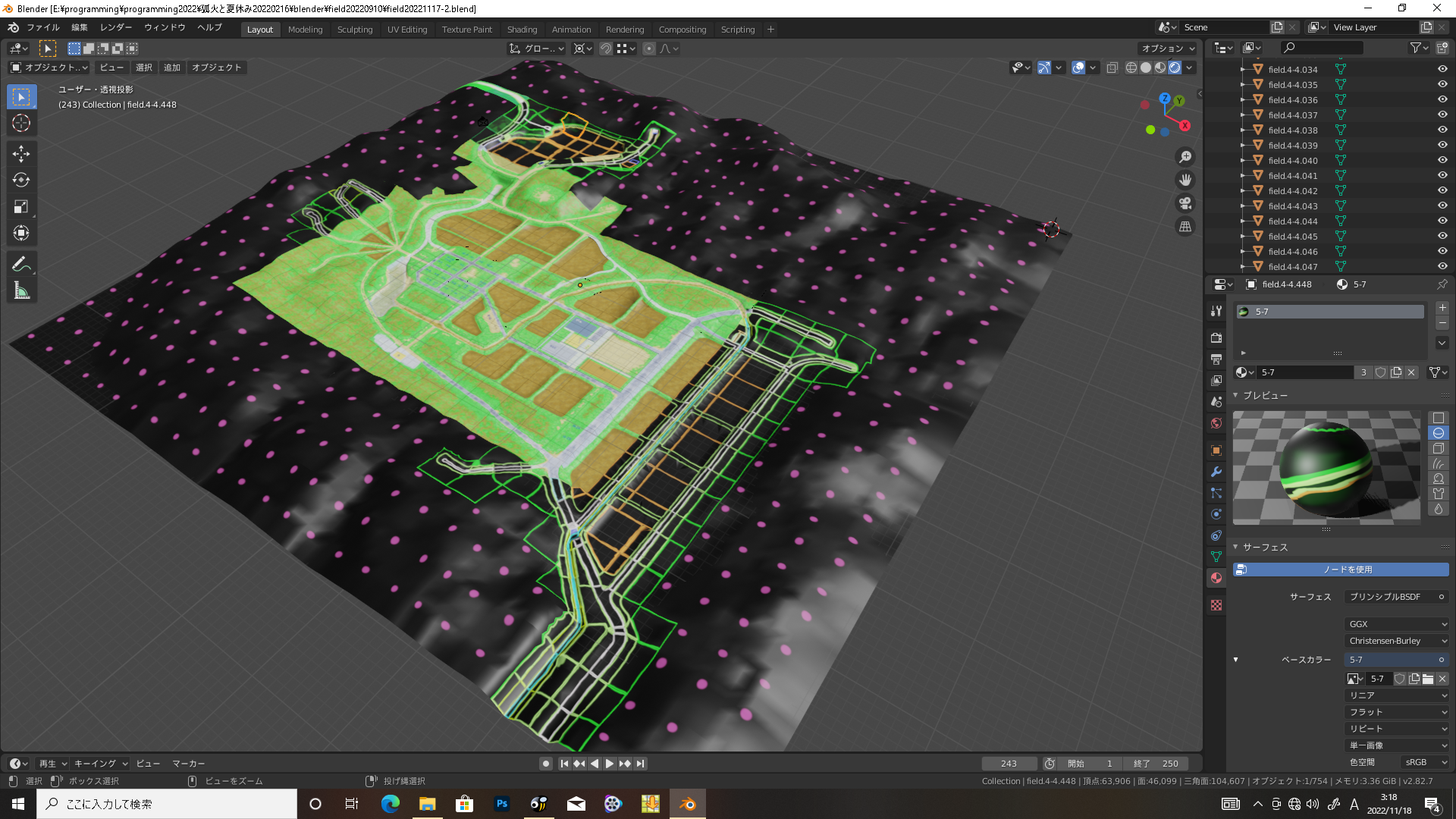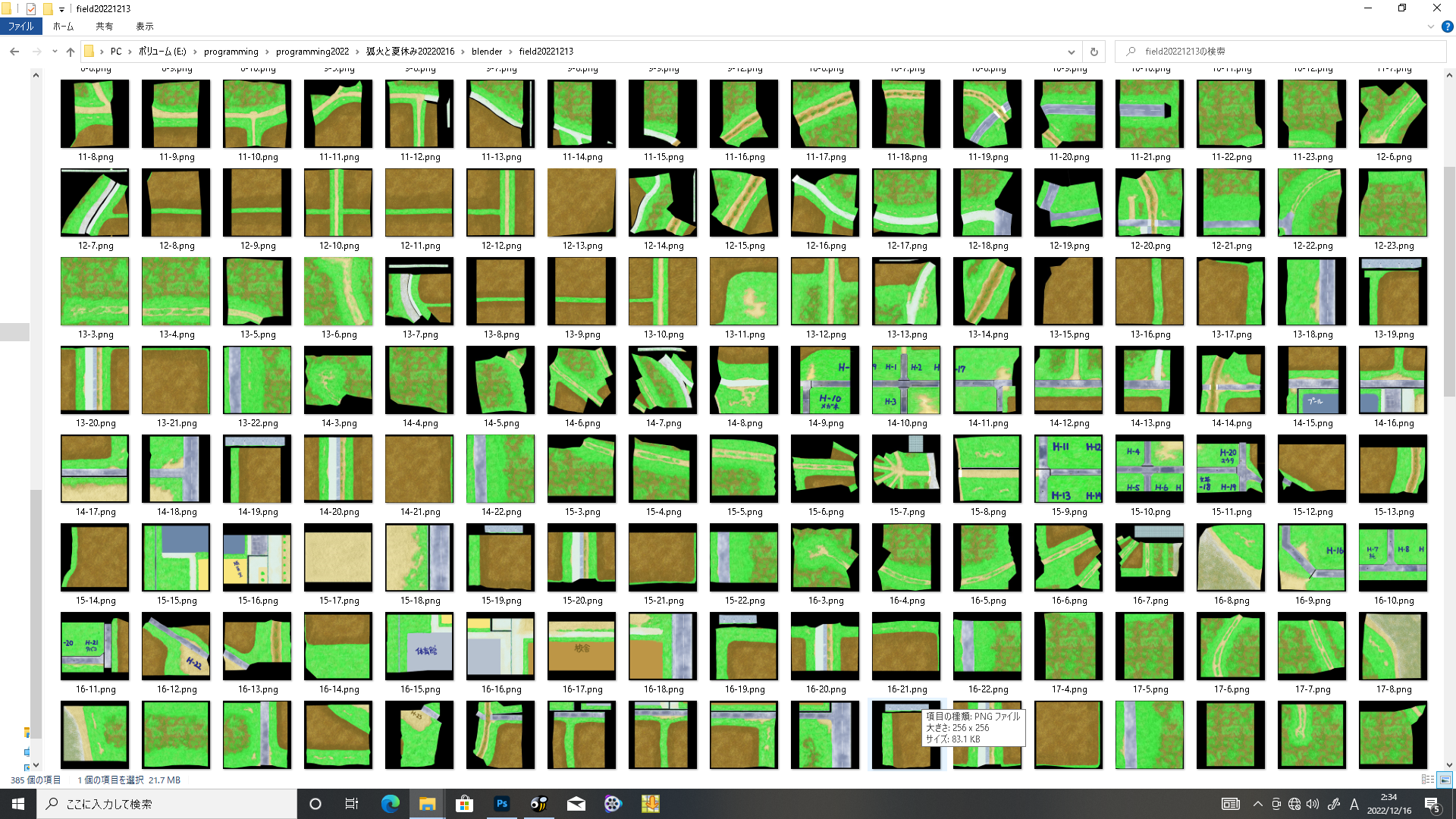 前回のテストフィールドではフィールドを7×7のブロックに分割していましたがモデルの解像度が低かったので今回1ブロックを更に4×4のブロックに分割しました。フィールド全体では26×26=676のブロックがあります。このブロック一つ一つをUV展開してPhotoshopでテクスチャを作る訳です。ここにスマートな解決方法などありません。力技で676ブロック作るのです!