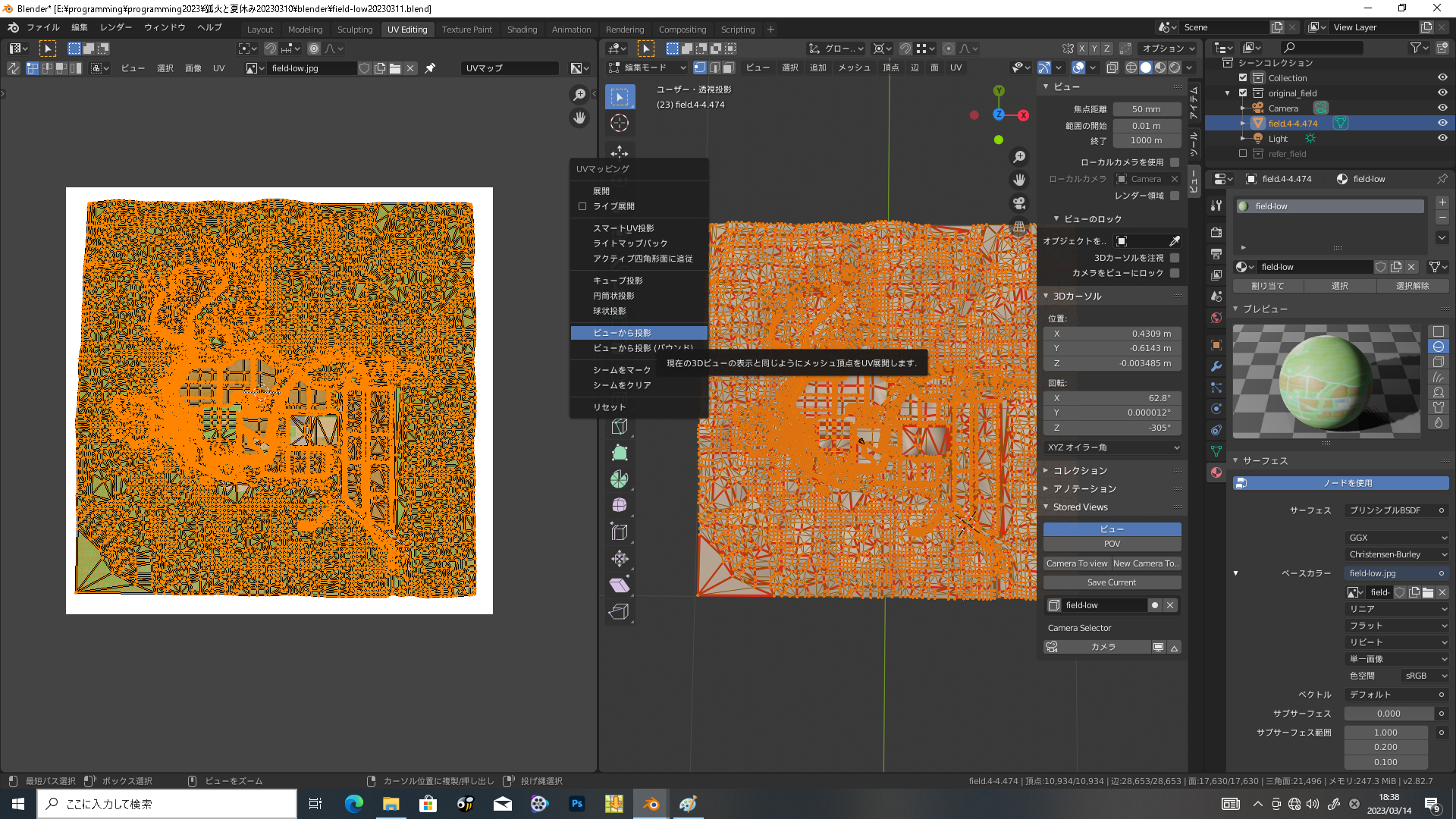 テクスチャが完成したらレイアウトモードに戻ってブロックをまとめて結合した後、頂点を距離でマージしてブロック分割境界の頂点を結合します。次にデシメートでモデル全体の頂点数を減らします。モデルが完成したらUVマッピングですが、UVエディタで先ほどのStored Viewで保存した視点に切り替えてViewから投影を選択してUV展開します。後はテクスチャと位置を合わせて完成です。
