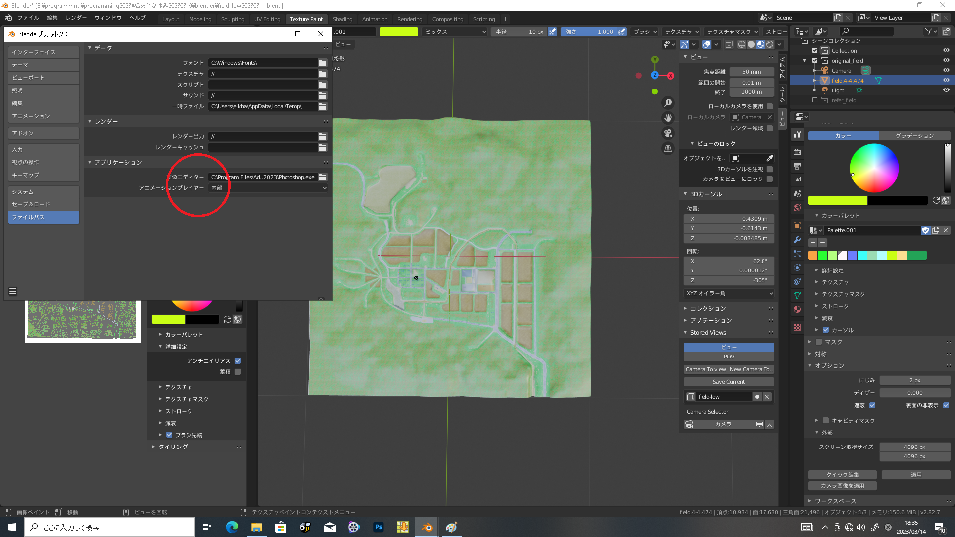 次に、Blenderにはペイントモードで現在のビューを外部アプリに書き出してくれる機能がありまして、これを利用してPhotoshopにテクスチャを書き出します。プリファレンスの外部パスにフォトショップのパスを設定し、ペイントモードのクイック編集ボタンをクリックします。この時に先ほどのStored Viewで保存したカメラ位置を呼び出してテクスチャを書き出します。