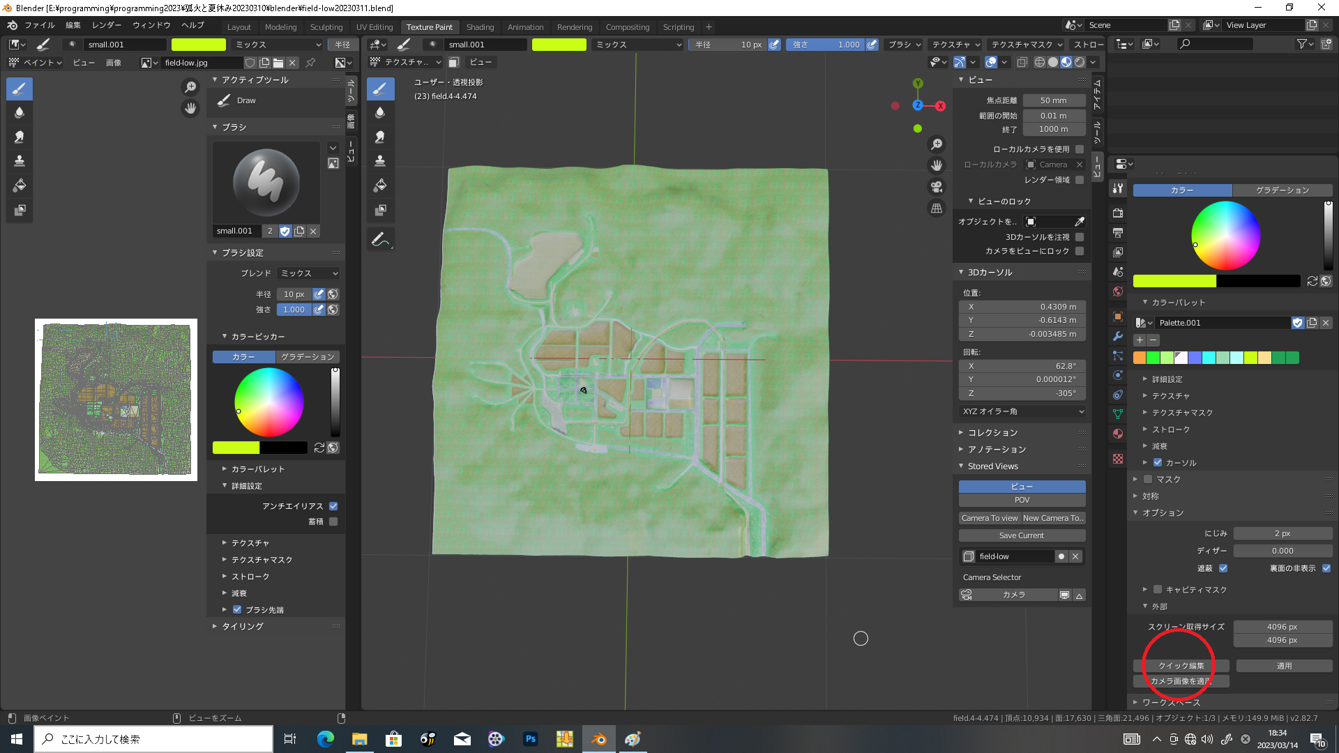 まずフィールド全体を表示した視点を保存しておきます。これはStored ViewというBlenderの標準アドオンにありますのでインストールしておきます。ViewのサイドバーからStored Viewを呼び出してカメラ位置を保存します。