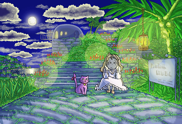出来上がりを見ると結構いい感じかも・・。しかし、今後のゲ制作の背景画を描くことを考えると、なんとか現在の漫画絵から脱却したいと試行錯誤中。 |